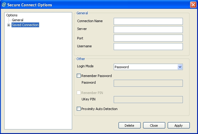 - In the Secure Connect Options dialog, select Saved Connection from the navigation pane and the login options will be displayed. See the picture below:
