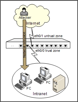 假设组网方式为:设备的ethernet0/1接外网,处于untrust安全域;ethernet0/0连接内网,处于trust安全域。组网图如下图所示: