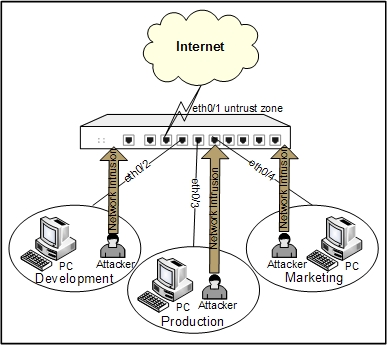 假设组网方式为:公司内部研发部、生产部和市场部分属于三个网段,三个网段分别通过ethernet0/2、ethernet0/3、ethernet0/4接入设备,三个接口所属安全域依次为Development、Production以及Marketing;设备的ethernet0/1口接外网,处于untrust安全域。组网图下图所示: