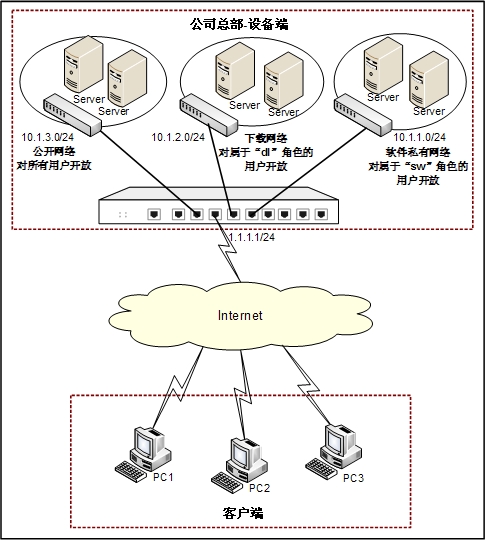 - 公司总部的软件私有网络网段(IP:10.1.1.0/24)的资源只允许属于角色“sw”的用户访问;总部下载网络网段(IP:10.1.2.0/24)的资源只允许属于角色“dl”的用户访问;总部公开网络网段(IP:10.1.3.0/24)的资源允许所有的用户访问;