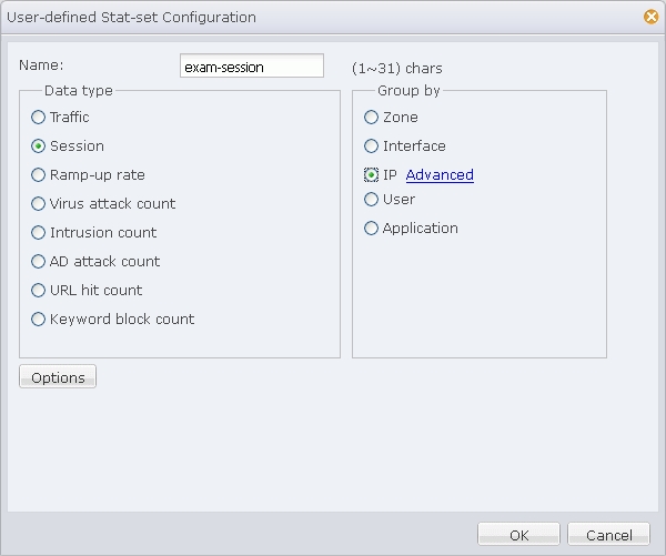 - In the User-defined Stat-set Configuration dialog, type exam-session into the Name box, and click Session and IP in the Data type and Group by list respectively, as shown below: