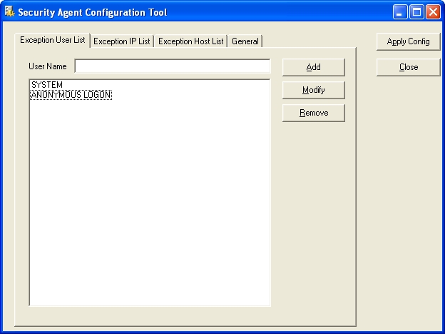 You can set exceptions (including Exception User List, Exception IP List and Exception Host List) in Security Agent Configuration Tool. The graph below shows the Exception User List dialog: