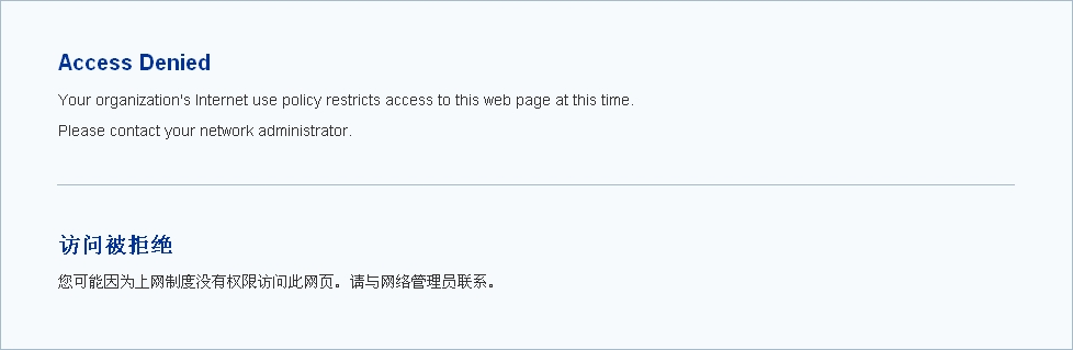 开启用户被阻断警告功能后,当用户的下列网络行为被网络行为控制规则阻断时,用户的Web浏览器中会显示阻断提示信息: