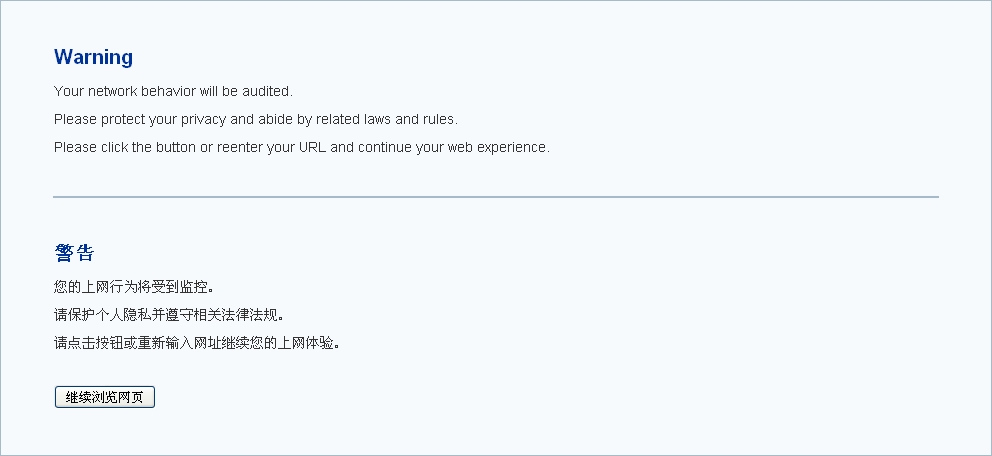 开启用户被监控警告功能后,如果用户的网络行为与系统中已配置的网络行为控制功能(URL过滤、网页关键字过滤、Web外发信息控制、邮件过滤和应用行为控制)相匹配,则该用户的HTTP网页访问请求会被重定向到用户被监控警告提示页面,提示其网络行为将受到监控,注意保护个人隐私并遵守相关法律法规。例如,如果创建URL过滤规则对用户浏览某网页的行为进行监控,并开启用户被监控警告功能,当用户浏览该网页时,用户PC的Web浏览器将显示用户被监控警告提示页面。如图所示: