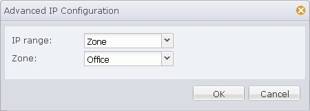 - Click Advanced behind IP. In the Advanced IP Configuration dialog, select Zone from the IP range drop-down list, and select Office from the Zone drop-down list, as shown below: