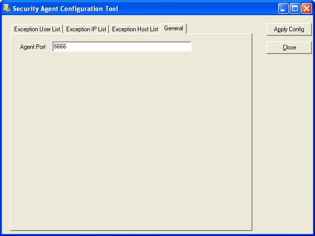 - Close: Closes the Security Agent Configuration Tool dialog.